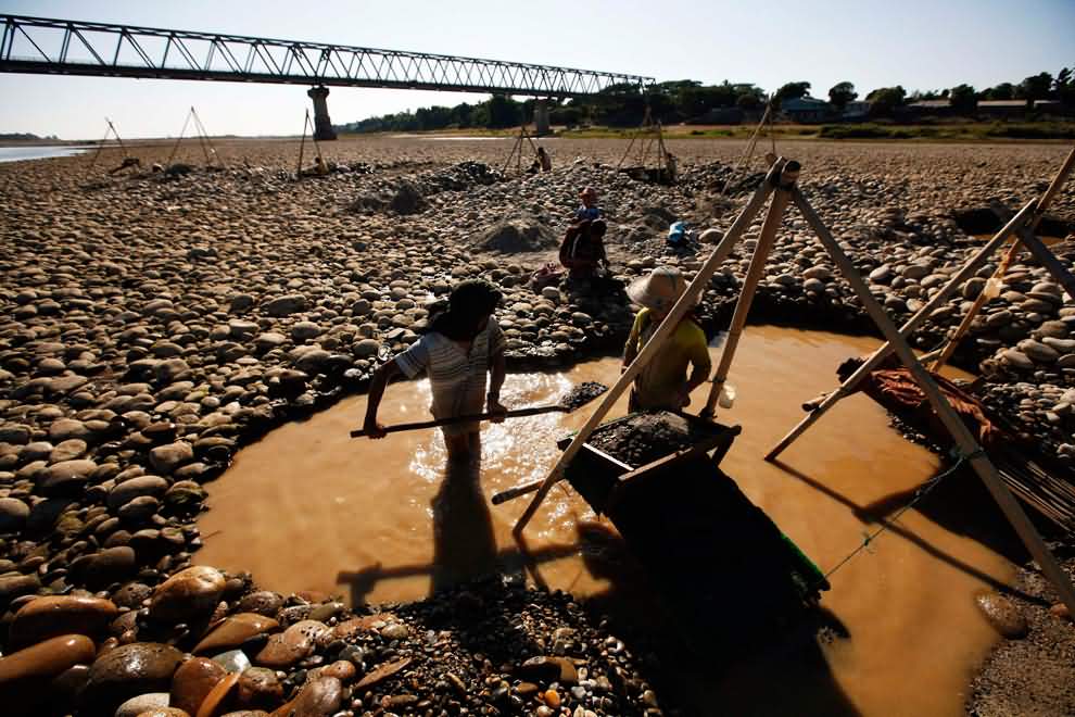 Villagers use tools to pan for gold from the Irrawaddy river near Bahalminhtin Bridge near the town of Myitkyina in the northern Myanmar on January 7, 2010.
